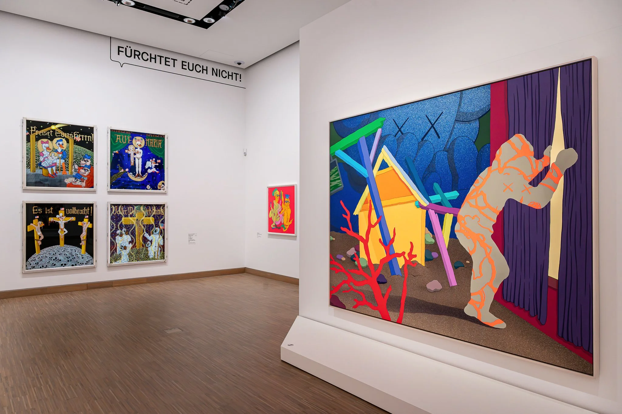 FÜRCHTET EUCH NICHT! ("Fear Not!") - paintings where comic-book conventions collide with Latin and German religious iconography. Crucifixions and speech bubbles in the same frame.
